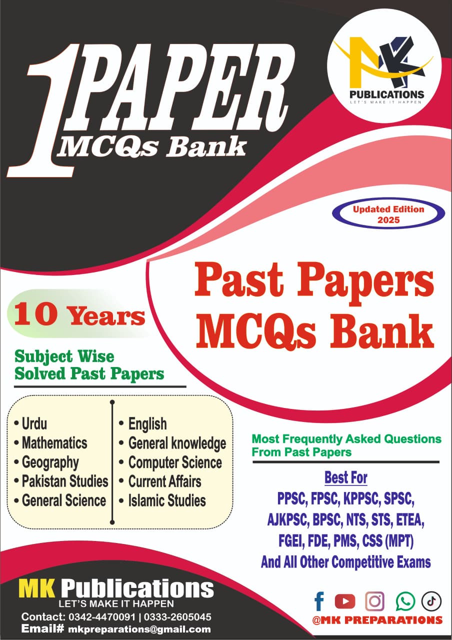 10 Years Solved Past Papers & One Paper Jobs Preparation Notes by MK Publications is a comprehensive preparation resource for aspirants targeting all one-paper government jobs in Pakistan. This guide provides a complete solution, including concept-based notes, one-liners for quick revision, topic-wise practice MCQs, and 10 years of solved past papers, covering every subject typically included in one-paper exams.