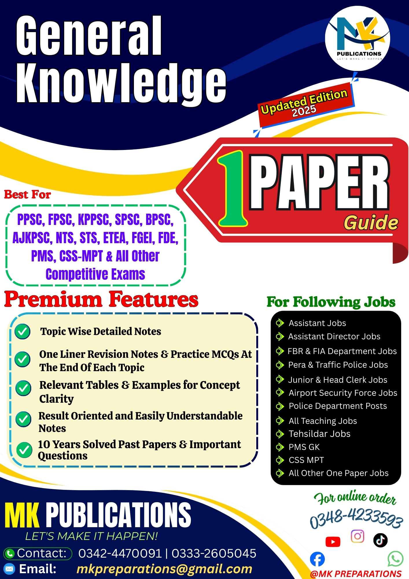 Prepare smartly for all One Paper Government Jobs with the most comprehensive and exam-oriented General Knowledge Notes by MK Publications. This book is specially designed for aspirants preparing for competitive exams conducted by PPSC, FPSC, SPSC, BPSC, AJKPSC, KPPSC, NTS, ETEA and other testing agencies in Pakistan.